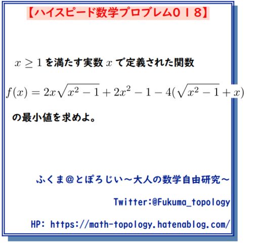 「秒で解ける数学の問題」がテーマのハイスピード数学プロブレム。 今回も根号を含む無理関数について最小値を考えます。 前回とよく似た関数が登場しますが…。